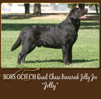 BOSS GCH CH Quail Chase Bearcreek Jolly Joe Sire: GCHB CH Quail Chase Broadway Joe Windfall Sire of Champions and Major-pointed get. Owned by Quail Chase Labradors |